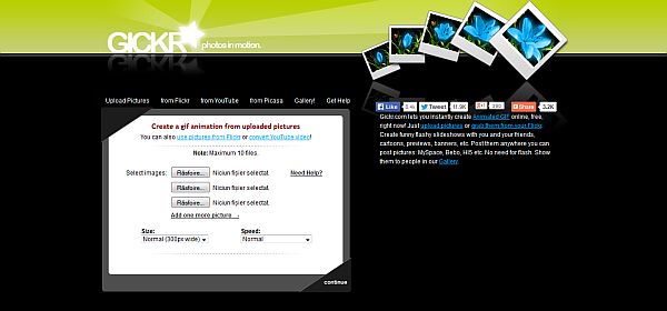 “Gickr.com lets you instantly create Animated GIFs online, free, right now! Just upload pictures or grab them from your Flickr. Create funny flashy slideshows with you and your friends, cartoons, previews, banners, etc. Post them anywhere you can post pictures: MySpace, Bebo, HI5 etc. No need for flash. Show them to people in our Gallery.”
