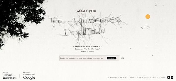 Another cool experiment on our list, The Wilderness Downtown is, as it says on the website, an interactive movie, done with the help of “some friends from Google”. The first thing the website does is ask you for the address where you grew up. Not the exact address, mind you, just the name of the street. After that, it creates a personalized music video for Arcade Fire’s “We Used to Wait”, using Google and HTML5, that has greater meaning to you.