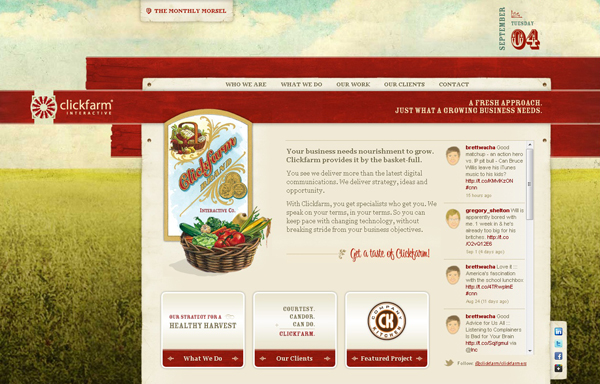 I absolutely love “Click Farm”……. Great originality and fun! The only problem was I didn’t know what they do until I read through quite a bit. As a Strategic Internet Marketing Specialist I would consider this a disadvantage, however the design is so unique I just had to read further to see what all they do; so in this case the design did work to make me want to read more! Bravo!!