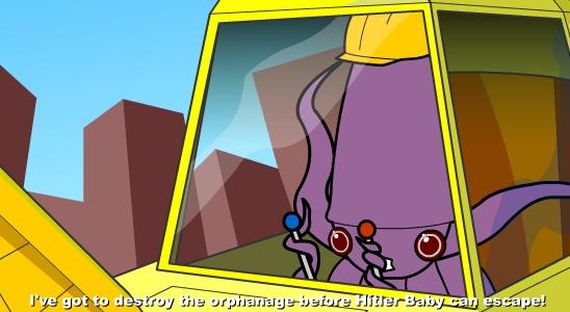 This is a parody featuring the “motion captured performance of Tom Hanks†and referencing the movie “The Polar Expressâ€. It is about a squid using demolition equipment to wreck an orphanage where baby Hitler lived and a woman’s house. Then a bank rises and turns out it’s a monster. Overall, it is a parody of the cheesy, over-the-top movie trailers with the deep-voice narrator and oneliners.