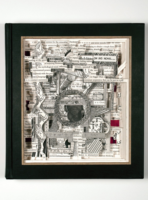“In this work I begin with an existing book and seal its edges, creating an enclosed vessel full of unearthed potential. I cut into the surface of the book and dissect through it from the front. I work with knives, tweezers and surgical tools to carve one page at a time, exposing each layer while cutting around ideas and images of interest. Nothing inside the books is relocated or implanted, only removed. Images and ideas are revealed to expose alternate histories and memories. My work is a collaboration with the existing material and its past creators and the completed pieces expose new relationships of the book’s internal elements exactly where they have been since their original conception.”