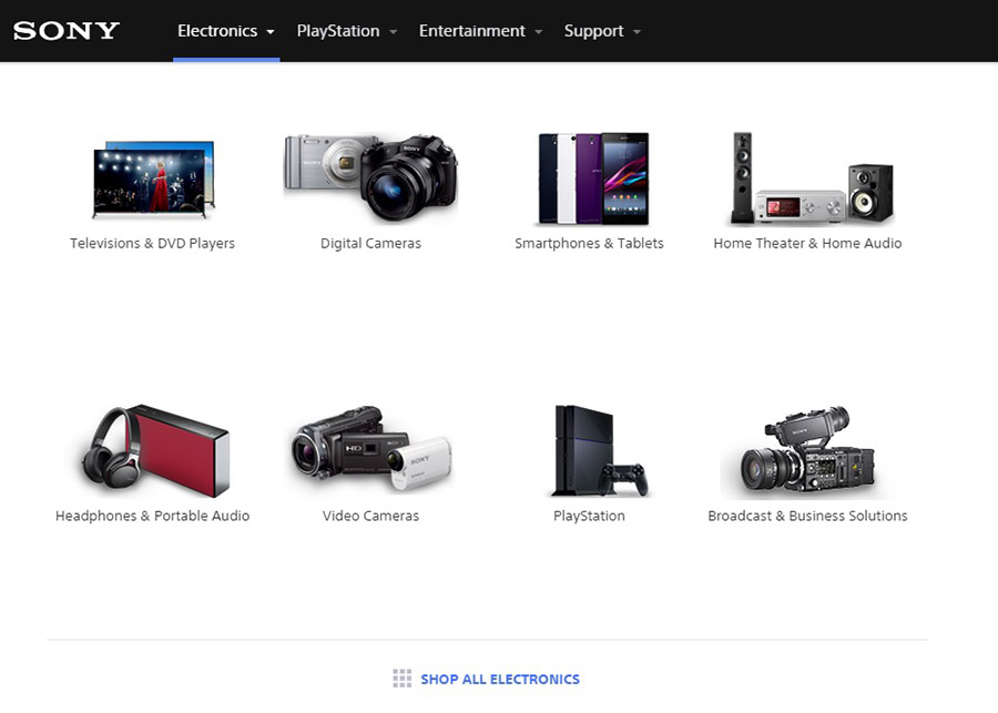 Sony is one of my favorite examples when it comes to great websites. They have thousands of products, so it’s hard to expose all of them without confusing visitors. To solve that, Sony sorted their products into categories, so they made it far easier to browse for the one you are looking for. They also have sections like “Shop and Compare”, “Accessories”, and “Support & Drivers” to every category.