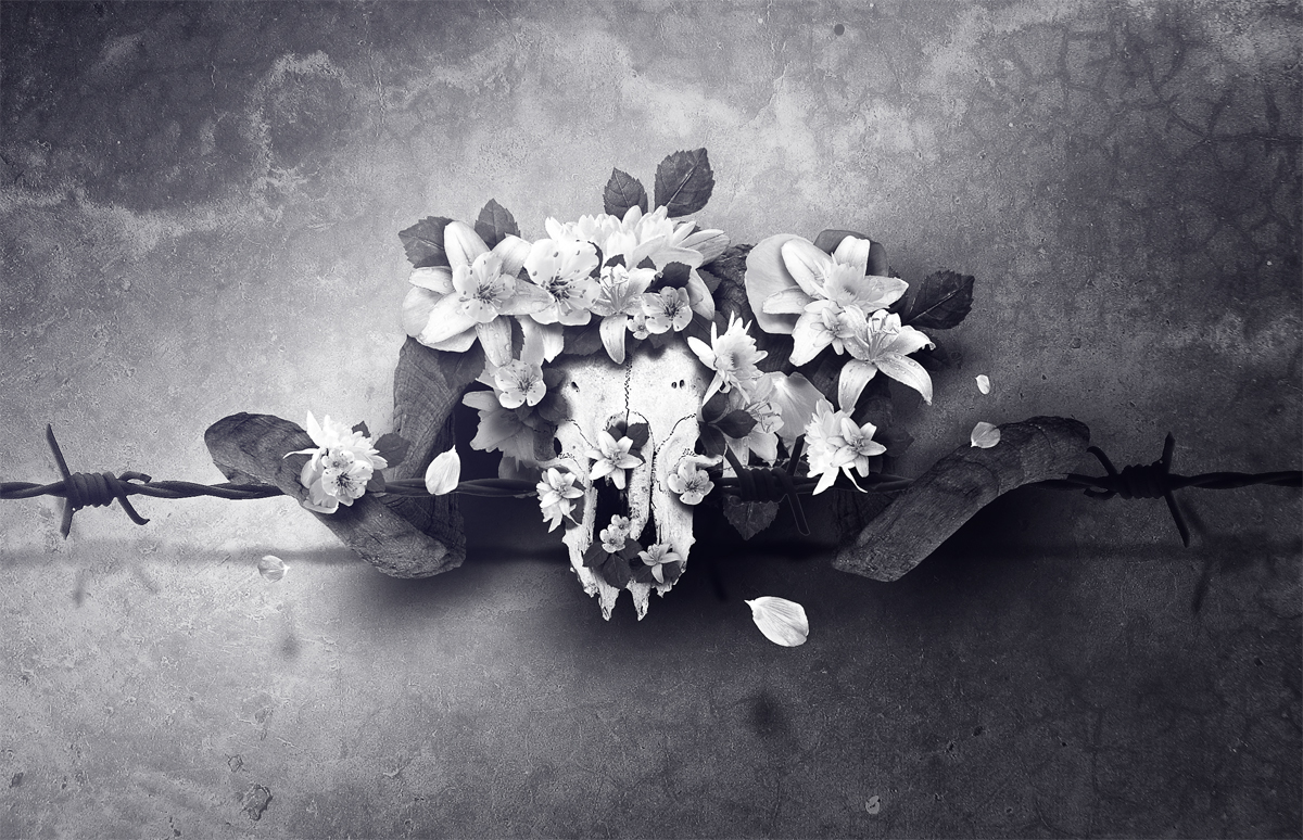 Let’s take care of some finishing touches! The barbed wire in the right has the light totally wrong – lets fix that. Hit CTRL+L and switch the lights and shadows sliders positions. Use levels for the wire below the skull, to make it darker.