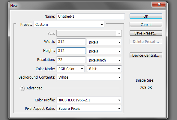 Create a new document of 512 x 512 px in RGB color mode at 72 dpi.