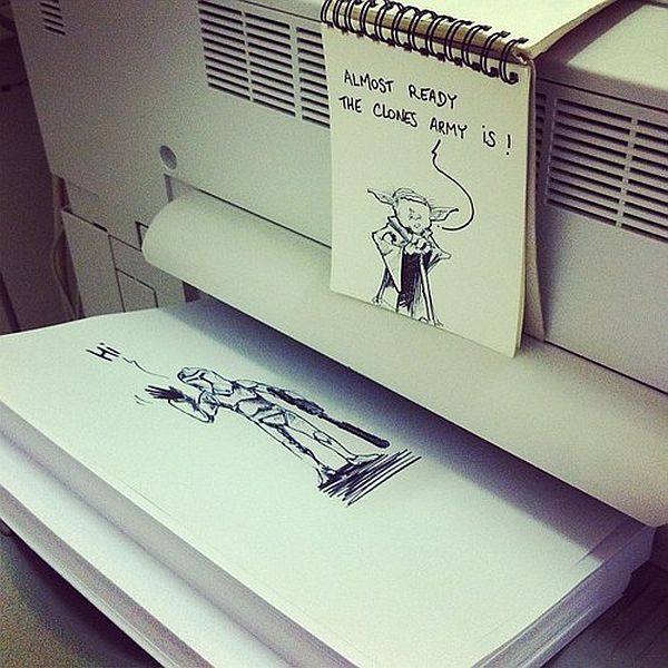 The sketches show either original or famous characters that “interact” with the environment to create funny situations. His advertisement work takes up the bulk of his time, but he does these doodles as often as he can, as his mind works way faster than his hands.