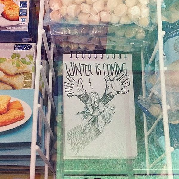 The main pun is fairly obvious here. We see Ned Stark warning us about the approach of winter while he is in a supermarket freezer. But the freezer can represent more than just the cold of winter. The freezer can represent Ned’s, and perhaps every character’s entrapment to the oncoming frost of winter.
