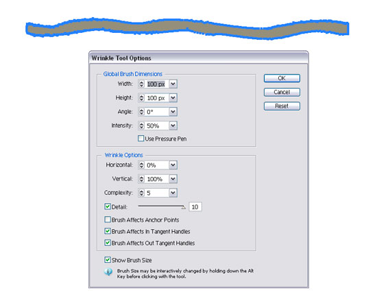 Hold click over the Warp Tool and select the Wrinkle Tool. Hit Enter and use similar settings like in the image below. Hit OK. Now click on the top and bottom edges of the distorted rectangle to obtain a tearing effect.
