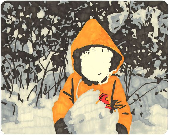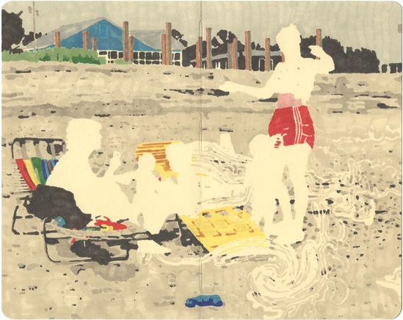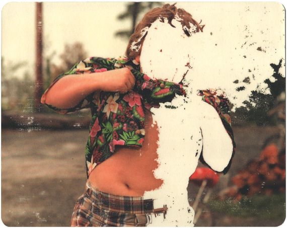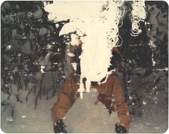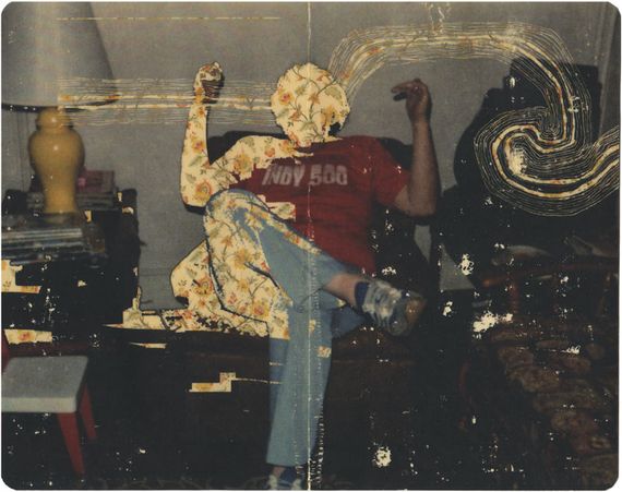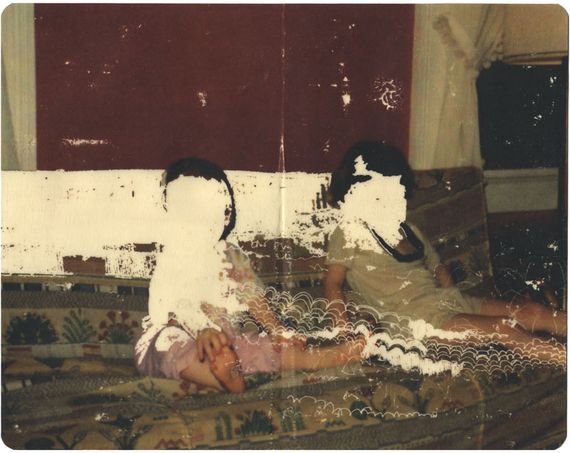 The erased images are meant to represent the fragmented/incomplete nature of memory. Â I go into family photos and erase elements to break down the stability of that frozen moment in time. Â In the overall idea of my work, the figures in the photos are meant to be the main characters in the story, the ones who come up with the larger themes that try to explain their environment. In this particular photo, the lines coming out of the figures are abstractions of thoughts, the figures interacting with or thinking about the things around them, and eventually coming up with the mythological and/or scientific explanations for the things going on in the world.