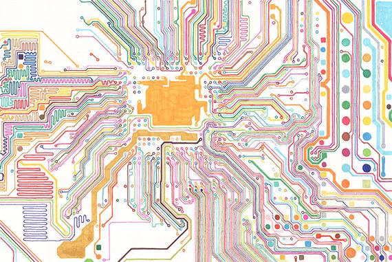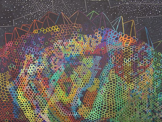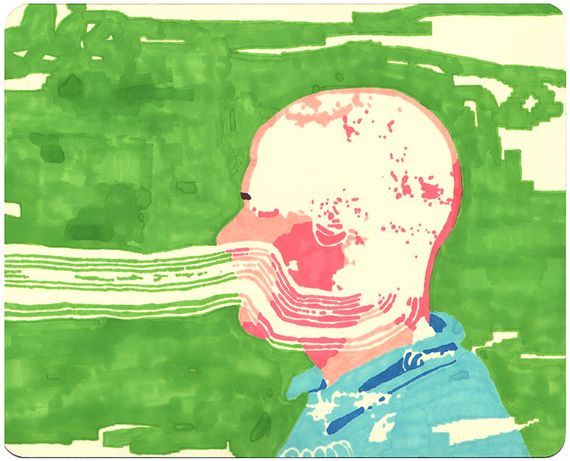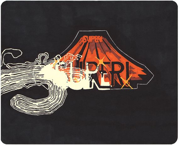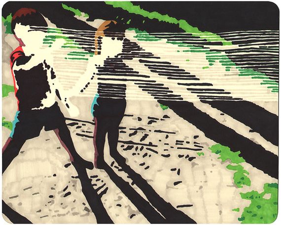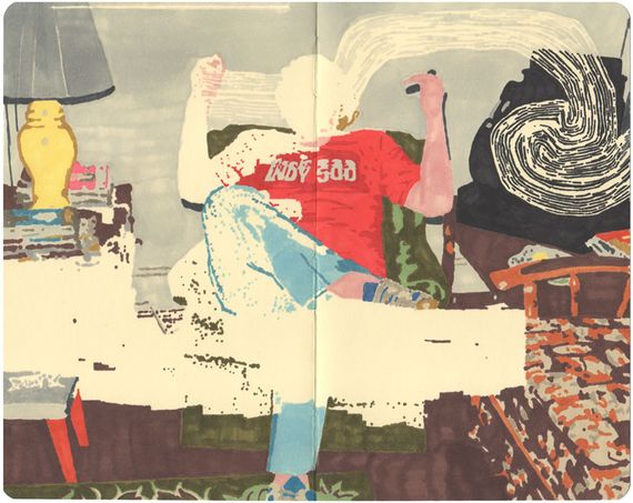 On paper I use Prismacolor and Copic markers, tracing images I’ve prepared on the computer using a light box. Â I have a step by step of the transfer process on my site (here) that gives a description of that process. Â On canvas, I’ll either use an opaque projector to reproduce that image I’ll then paint in oil or acrylic. Â With the oil, I use a lot of paint thinner and stand oil. Â For the hard edge acrylic paintings, I use masking tape and cut out each color area with an xacto knife. Â I also use dry wall sanding blocks with water on the surface of the acrylic paintings to control texture or make lower layers of paint visible, as well as giving it an overall washed down and eroded effect.