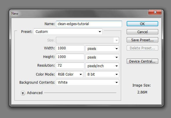 Go to File > New… (CTRL+N) to create a document of 600 x 600 px in RGB color mode at 72 dpi.
