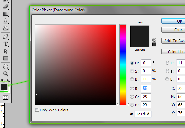 Set the foreground color to a dark gray (#1d1d1d) and hit ALT+Backspace to fill the “Background” layer with this color.
