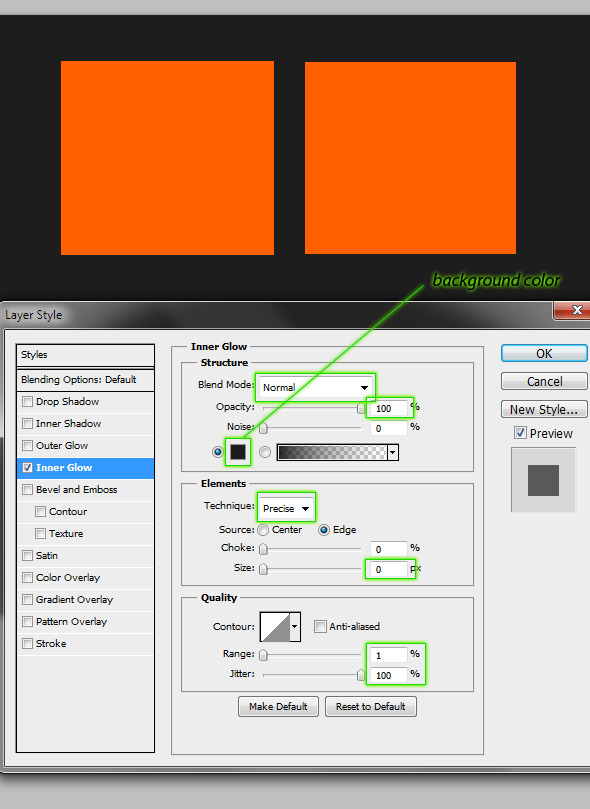 If you change the background color, go to the Inner Glow setting and change that color, as well.